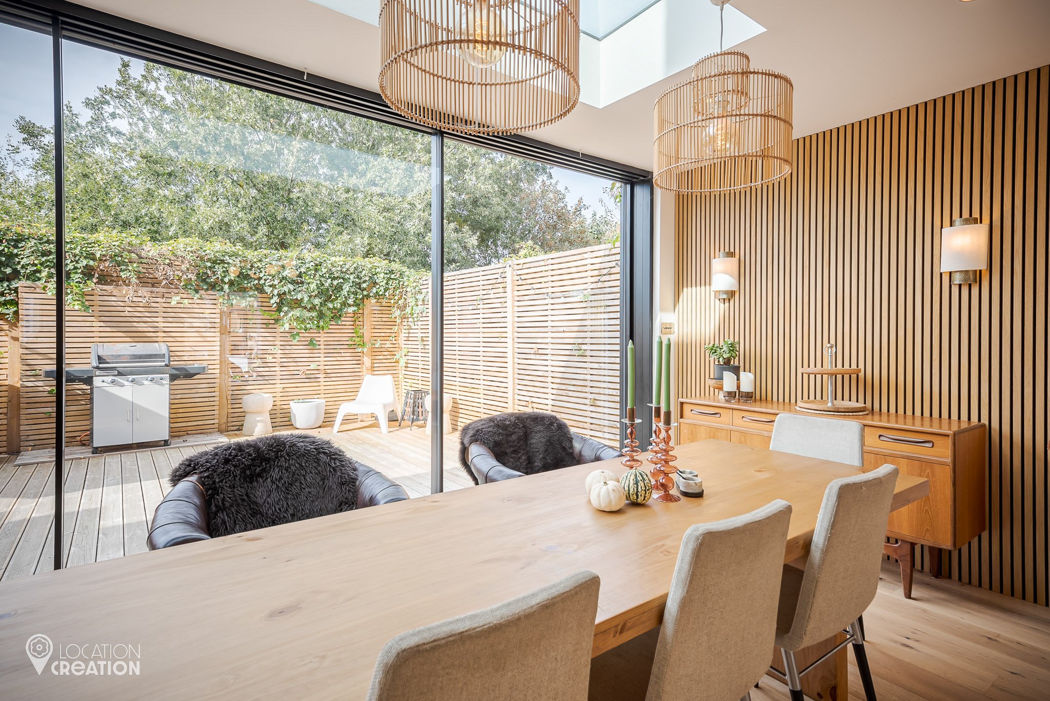 Telford Park is a double-fronted Victorian home and has abundant space for shooting and recording podcasts, particularly in the generous living room. This open-plan space offers easy access to the kitchen and adjacent rooms, making it ideal for kit, crew and production. The living space overlooks the garden and swimming pool, creating a stunning backdrop from every angle.
